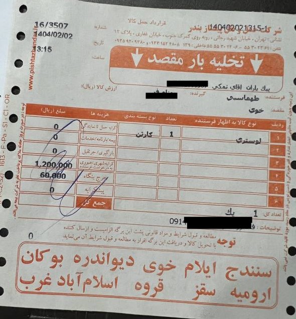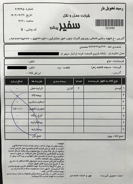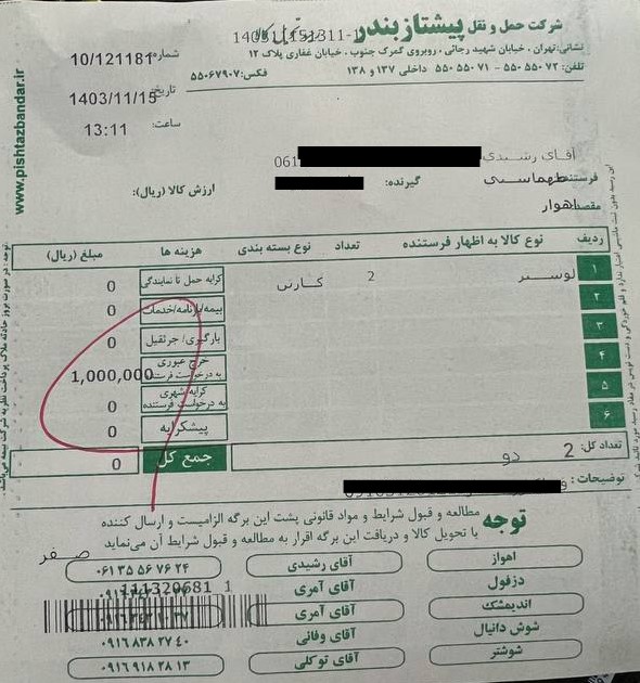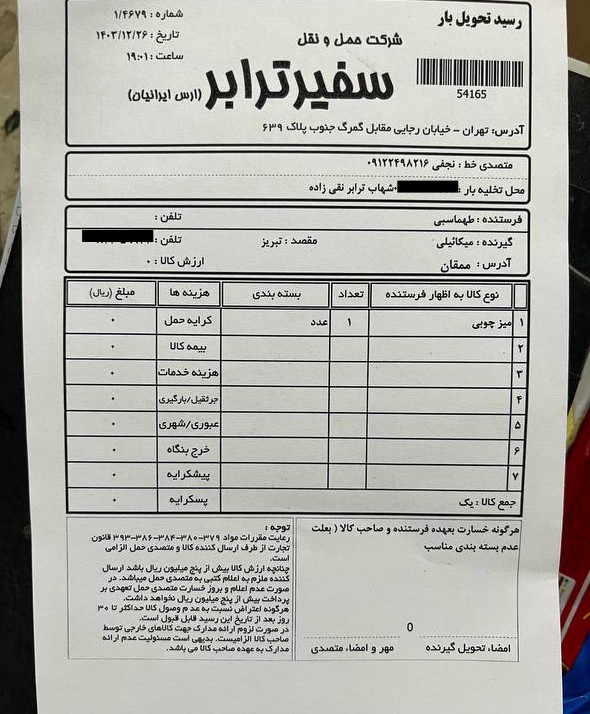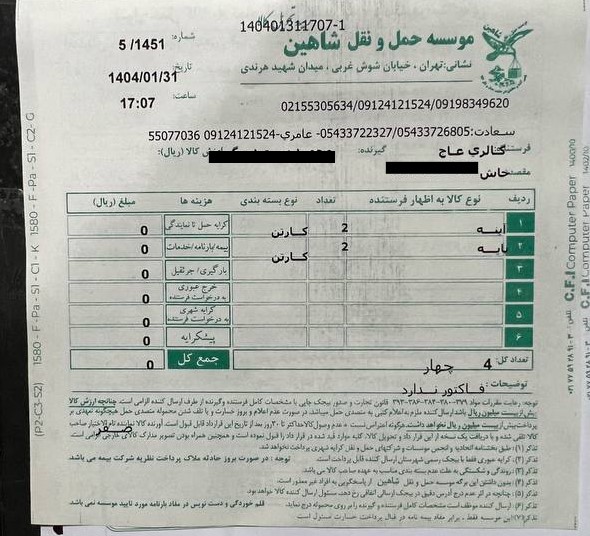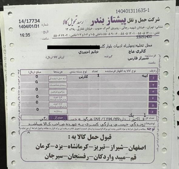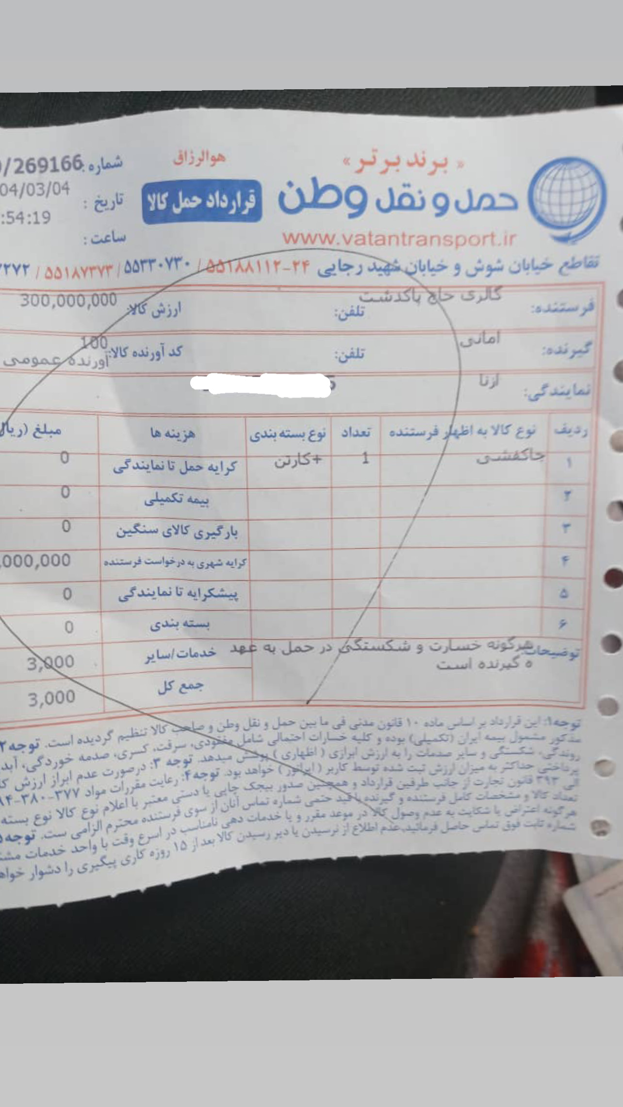 اینجا برخی از عکسهایی از حوالههای باربری، بارهای ارسالی ، تحویلی ها ،بارگیری ها و رضایت های مشتری و برخی از پیامهای رضایت مشتریان عزیزمون قرار دادهایم تا با خیال راحتتری از خدمات ما استفاده کنید و به کیفیت بستهبندی، ارسال مطمئن با باربری های امن و رضایت بالای مشتریان گالری عاج اطمینان داشته باشید.