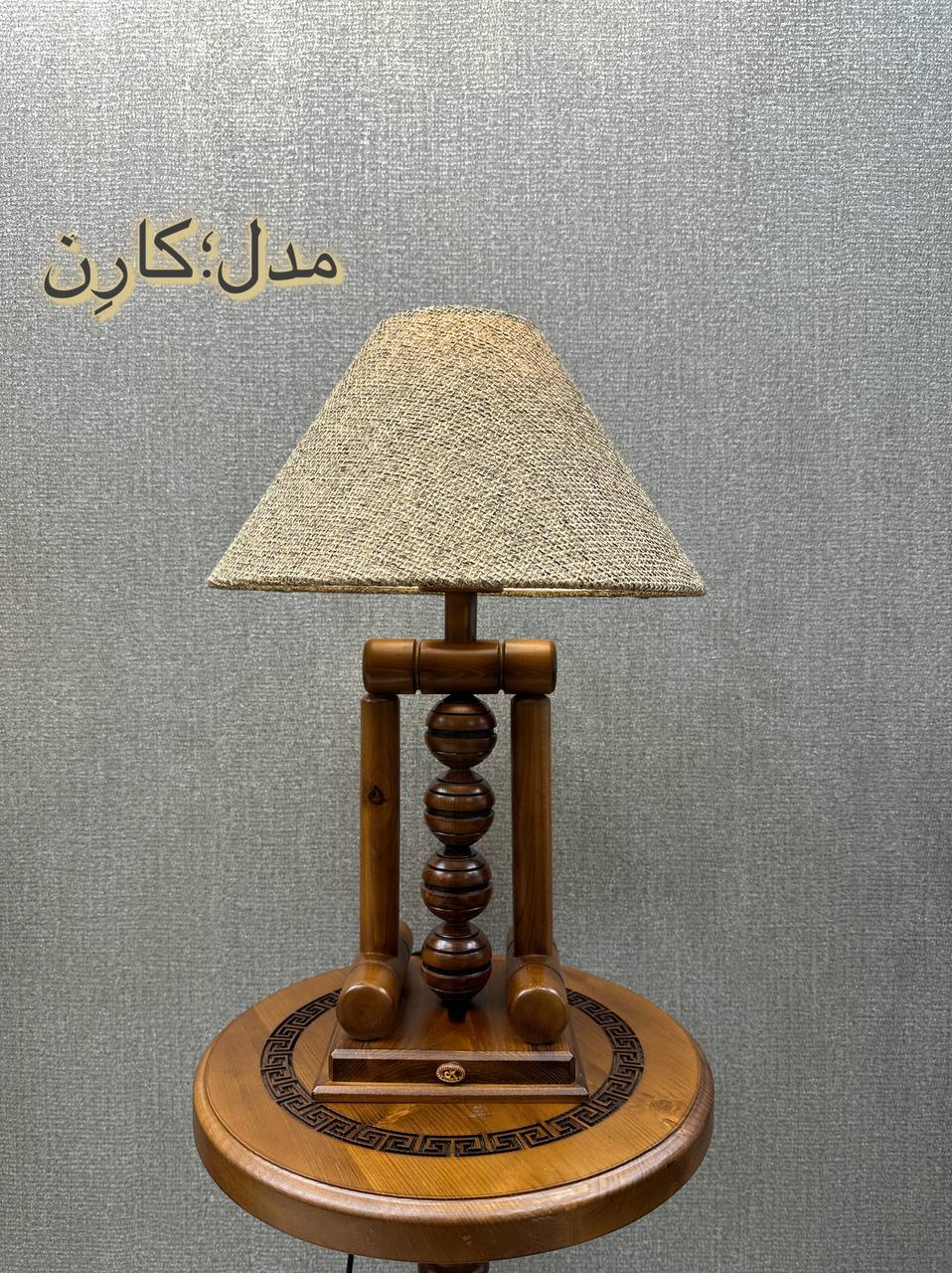آباژور رومیزی کارن از جنس چوب روس طبیعی می باشد و جنس پارچه شید هم از نوع پارچه های مبلی نیز است .