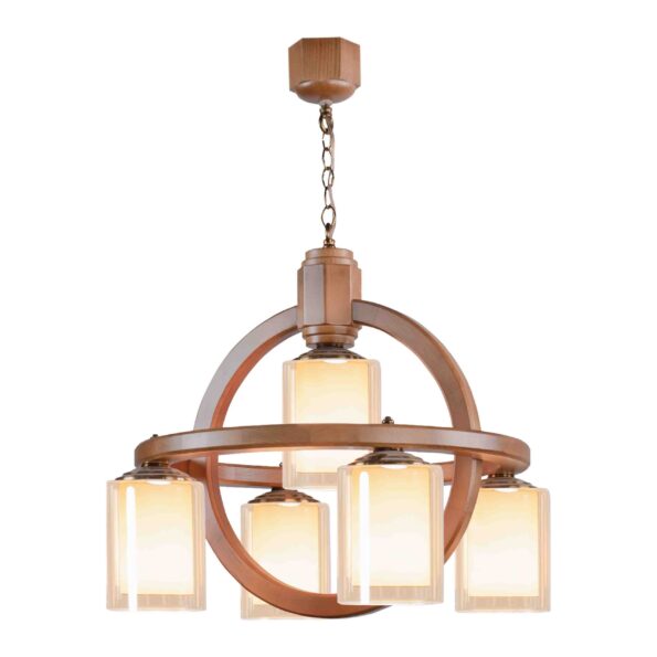 لوستر چوبی رومن ۵ شعله معکوس دارکار | تلفیق اصالت چوب و نورپردازی خیرهکننده