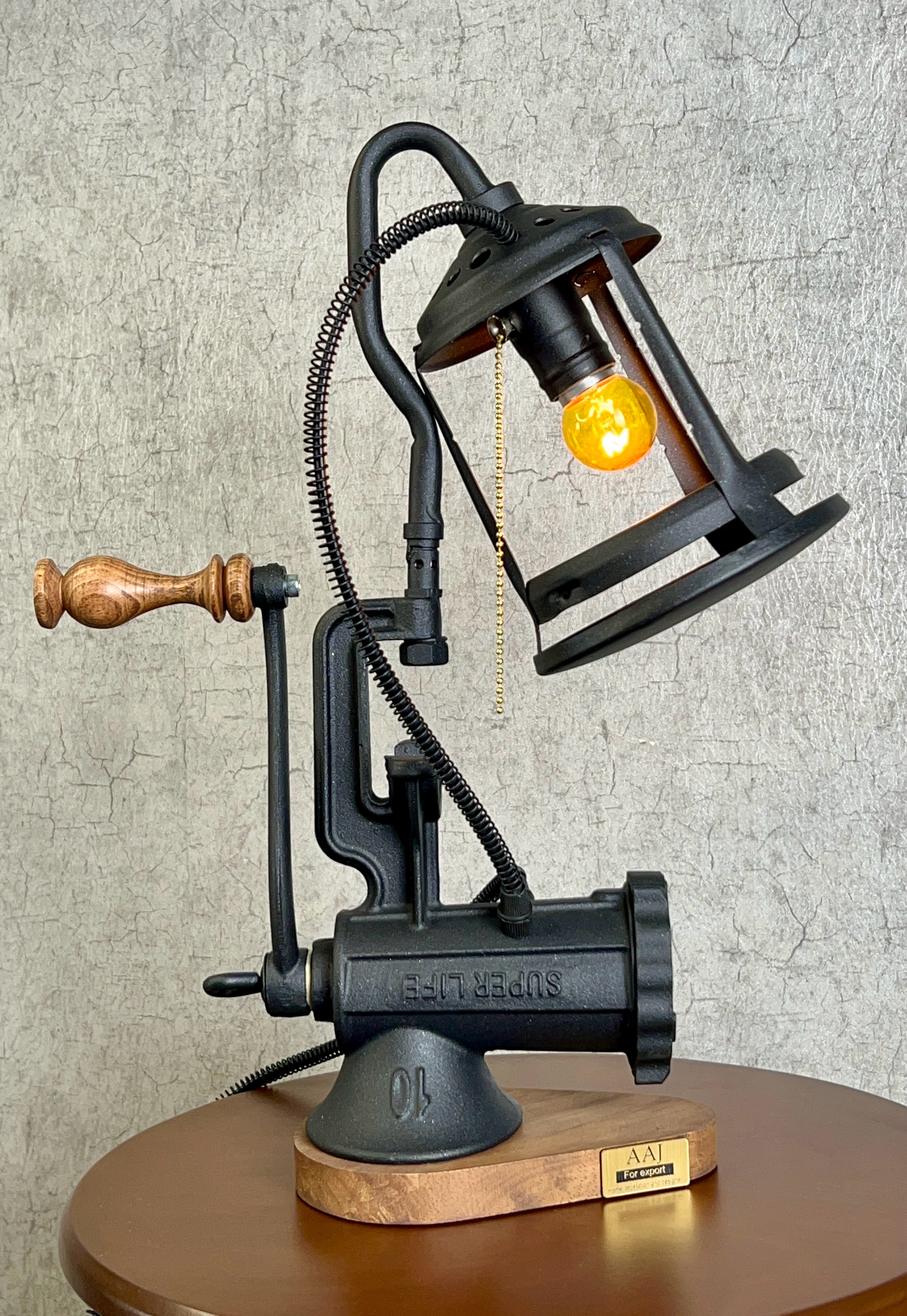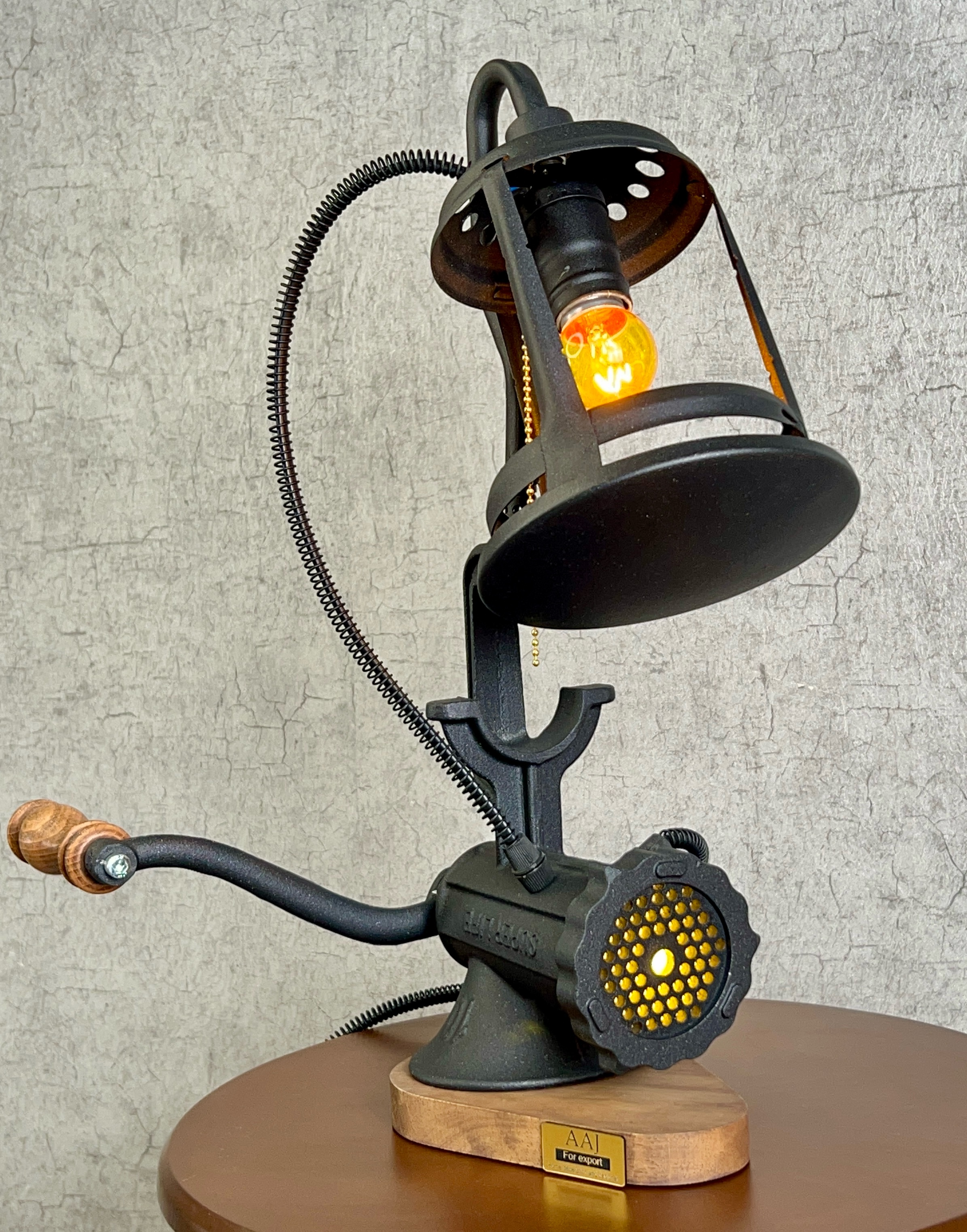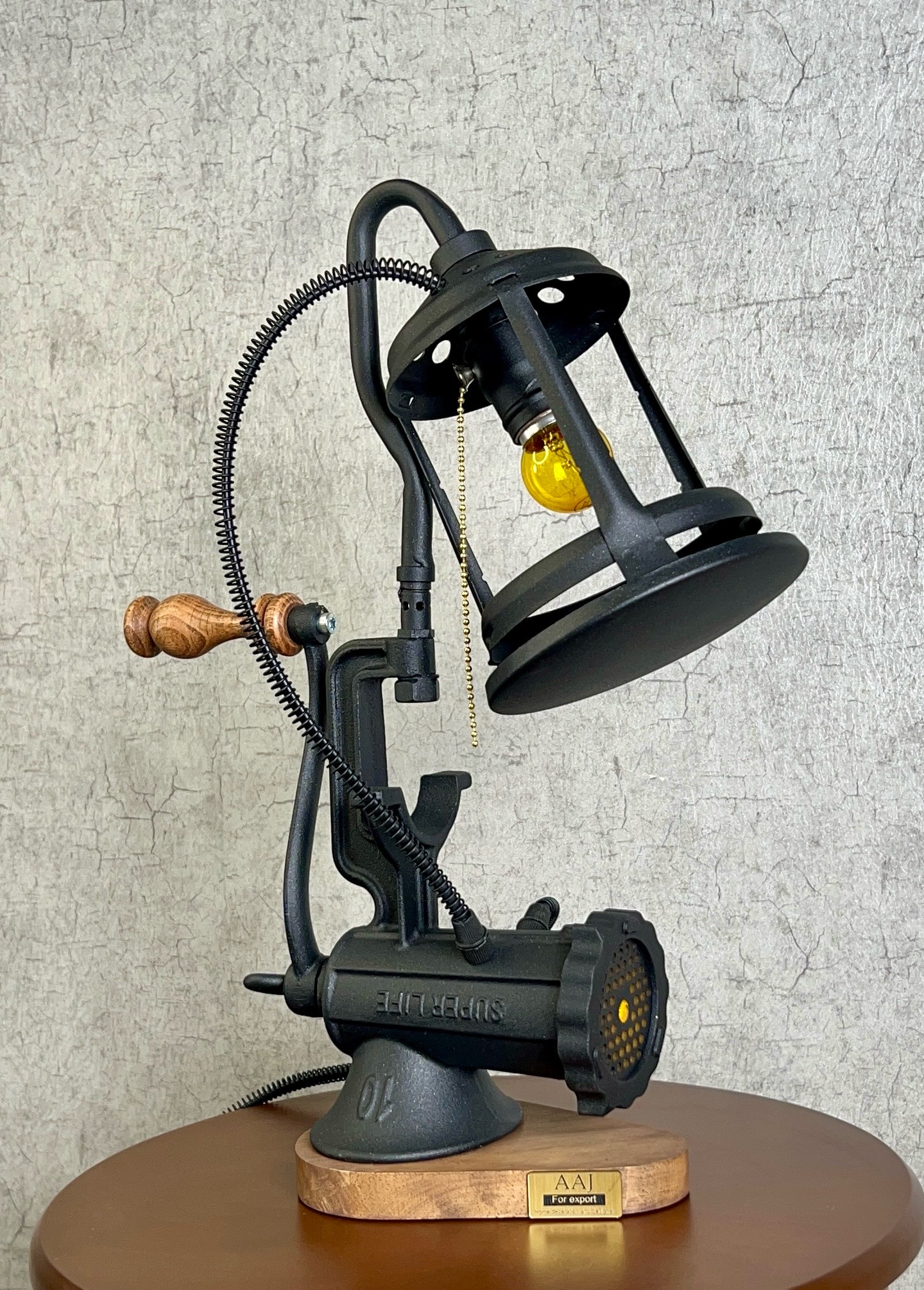 آباژور رومیزی خاص تلفیقی چوب و فلز – الهام گرفته از نوستالژی چرخ خیاطی و چرخ گوشت