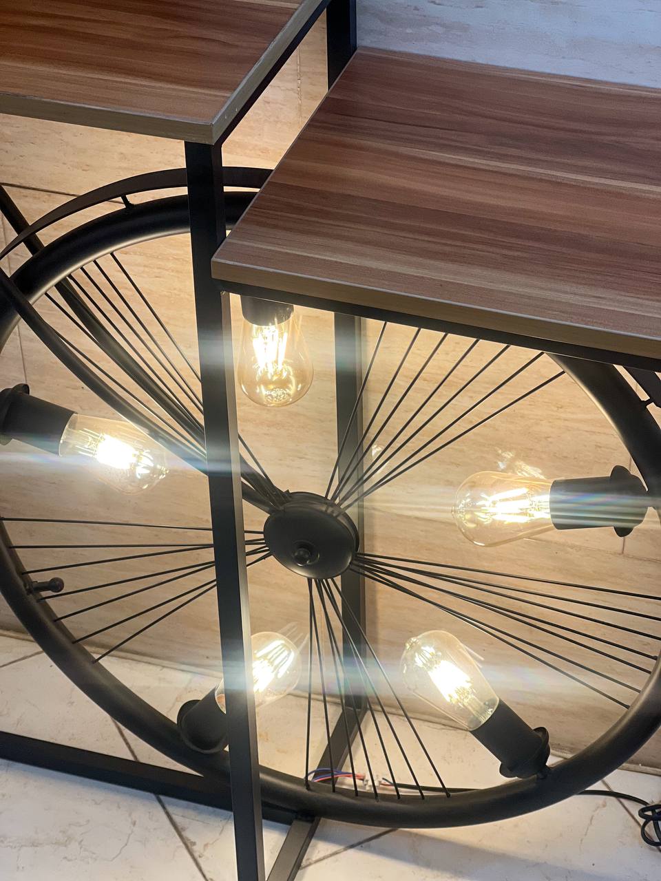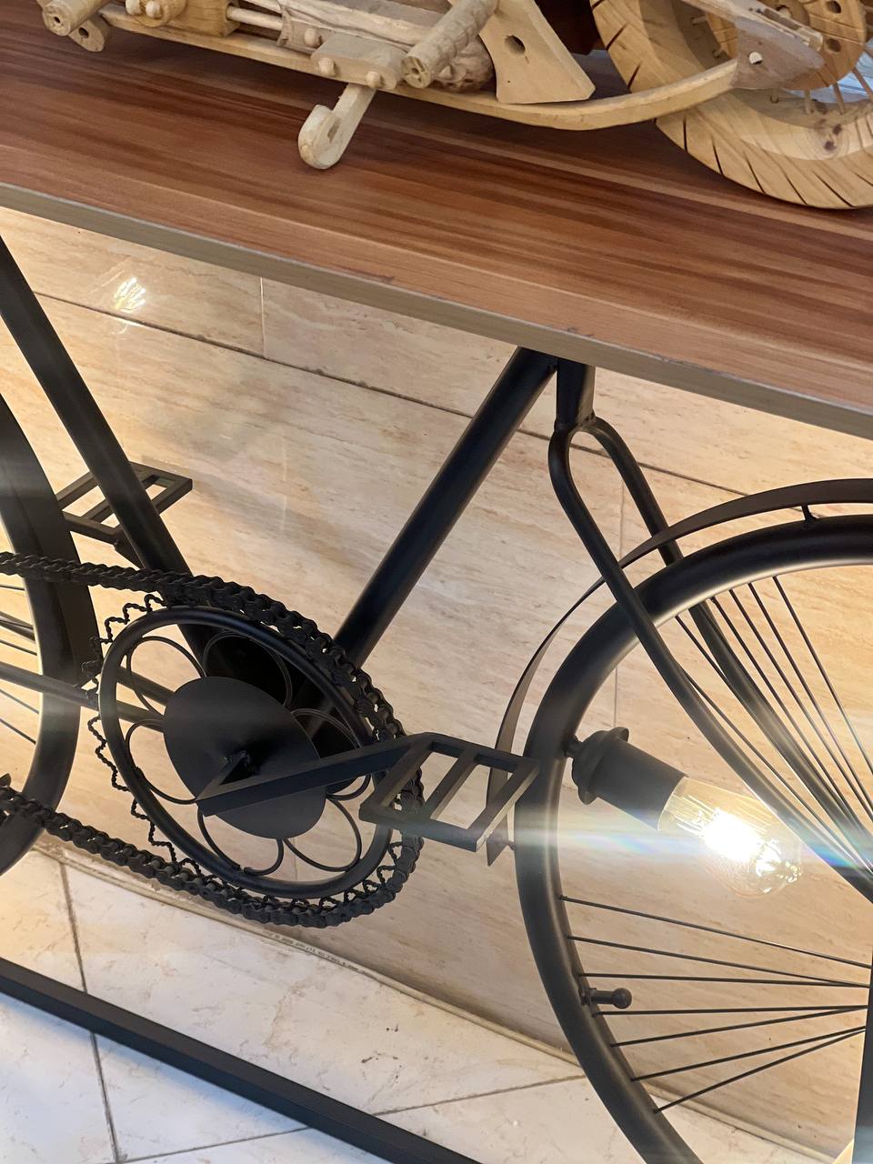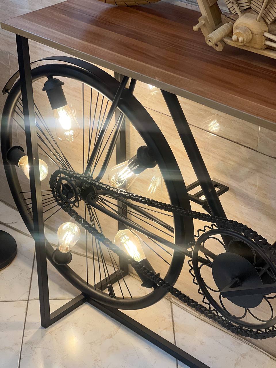 میز کنارسالنی جدید دوچرخه استند یا میزی یا کانتری است که در کنارسالن به عنوان یک کانتر بار یا میزبار سالنی و یا آباژور کنار سالنی به عنوان یک استند کنار سالنی مورد استفاده قرار می گیرد. آباژور یک وسیله روشنایی و تزیینی است که برای زیباتر کردن منزل یا محیط کار استفاده می شود کنار سالنیه دکوراتیو دوچرخه از جنس فلز با رنگ استاتیک مشکی مات می باشد که با صفحه های چوب روسی به رنگ عسلی می باشد و هر چرخ محصول دارای پنج سرپیچ بزرگ E27 می باشد .