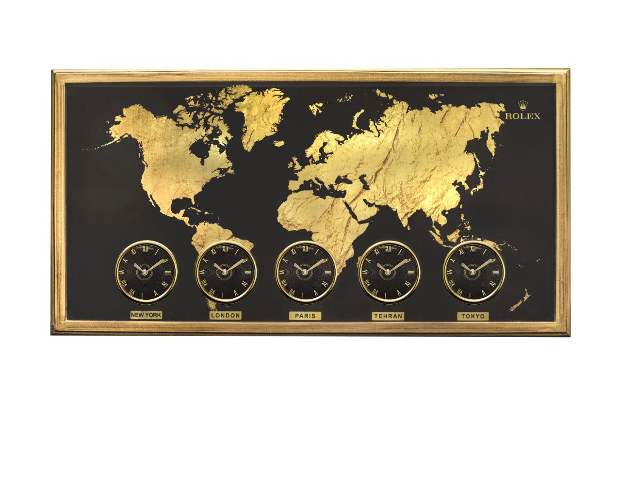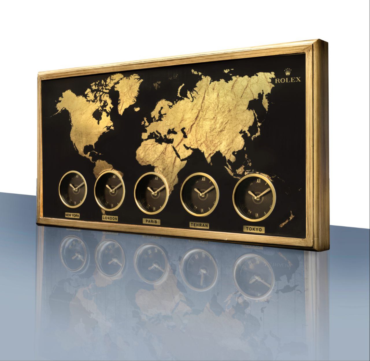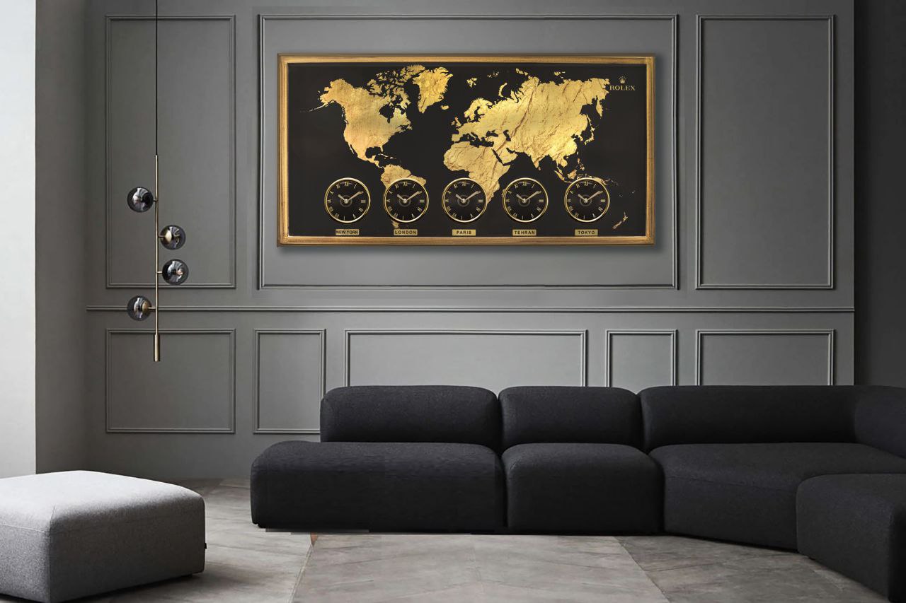 تابلو ساعت رولکس جهان نما کد 10 از جنس تلفیقی چوب و PVC و 5 موتور تایوانی درجه یک با ضمانت 6 ساله شرکتی است . قاب ، صفحه ، اعداد و عقربه این محصول رنگ رز گلد طلایی و پس زمینه رنگ مشکی مات می باشد که به 5 زمان مختلف ( نیویورک ، لندن ، پاریس ، تهران ، توکیو ) قابلیت تنظیم دارد و جزو خاص ترین ساعت های دیواری کالکشن گالری عاج می باشد .