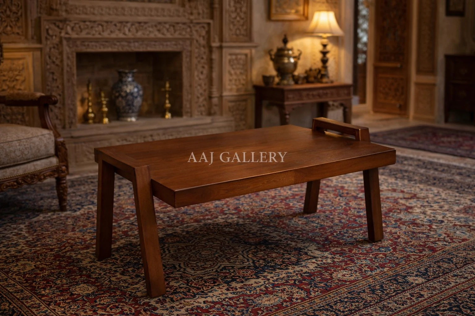 میز جلو مبلی تمام چوب طبیعی با رنگ فندوقی گرم و جذاب | ابعاد استاندارد ۹۰×۶۰ و ارتفاع ۴۲ سانتی‌متر | همراه با بیمه اصالت گالری عاج و ۲ سال ضمانت بدنه